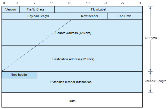 IPv6特性具有很强的可扩展性,可以在IPv6包头后的扩展包头中添加新特性。IPv4包头最多只能支持40字节的可选项,而IPv6扩展包头的大小仅受到整个IPv6包最大字节数的限制。