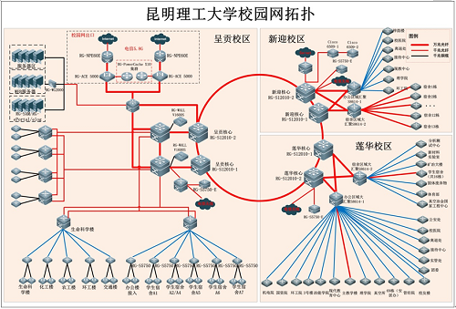 昆明理工大学校园网用户约5万人,用户数量非常庞大。2011年9月至2012年底,学校先后进行两次校园网系统改造及优化,并投入使用,具体如下图所示: