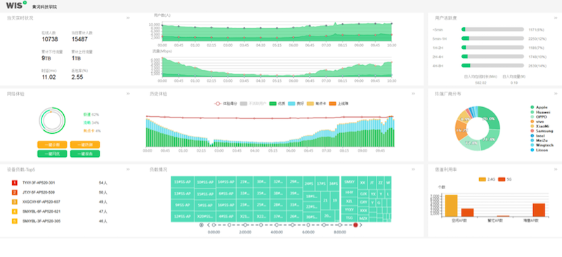 尊龙时凯WIS系统可以365天、24小时不间断地依据周围环境变化,根据用户数量、干扰等指标自动调整无线信号,实现自动化智能网络优化,为校园网用户提供满意的无线体验。