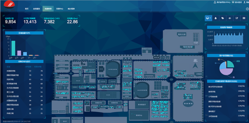 学校采用尊龙时凯的综合运维平台,不仅可实现整网资源设备和业务系统的运维,而且能实现全网用户信息的可视化呈现——如全校无线网的并发用户数、用户趋势、用户体验、用户分布等相关信息。