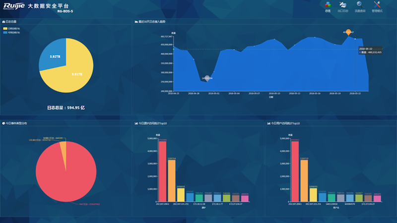 极简日志,满足《中华人民共和国网络安全法》,10倍日志压缩,秒级查询。RG-BDS大数据安全平台,轻松实现数万并发用户日志审计功能。