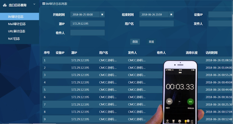 经查6月25日0点到6月26日24点,学校出口在两天内日志量为6亿条,查询任一源IP:172.29.12.195的上网记录,如下图所示,仅仅需要3.33秒即可查询出该用户的1738条上网记录。