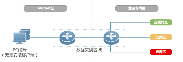 用户在整个资源访问过程中,所有数据都会经过SSL VPN进行加密传输,RG-WALL 1600-VPN安全网关提供安全的访问,即用户PC终端隔离互联网、在专网区域分区管控用户访问业务专网的资源。