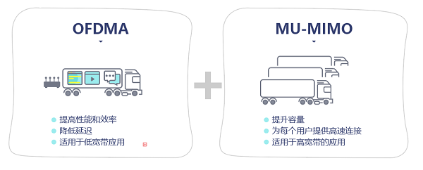 • 支持多用户传输技术即上下行MU-MIMO(多用户多进多出)与上下行OFDMA(正交频分多址),提升高密度部署场景下的并发能力和终端平均速率