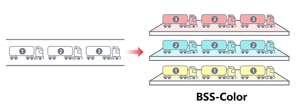 BSS(Basic Service Set),增加 6bit 的标识符,区分不同AP相同信道的BSS,6bit至于报文头部,这样AP收到非自己的报文时无需像以前那样整包解封装后才丢掉,只要解封装物理导码即可丢弃从而避免冲突,这样使用信道资源更有序、更确定,从而大幅提升密集环境中系统整体性能。