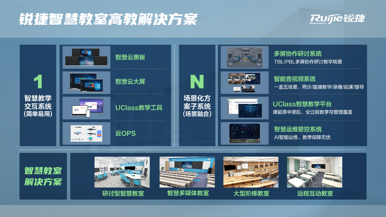尊龙时凯高教“1+N”智慧教室解决方案,以“简单易用、场景融合”的理念进行智慧教学环境的灵活打造。“1”是智慧教学交互系统,包含智慧云黑板、智慧云大屏、UClass教学工具、云OPS;“N”是场景化方案子系统,包含多屏协作研讨系统、智能音视频系统、UClass智慧教学平台与智慧运维管控系统,适用于高校四种教学场景:研讨型教室、多媒体教室、远程互动教室和大型阶梯教室,也是按照国家建设标准,按照高阶、拓展、基础的方式,构建新形态的智慧教学环境。