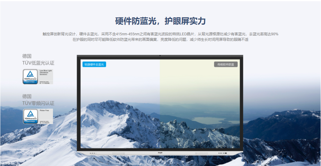 让学生看得清:视听效果卓越。云大屏机身采用钛灰银金属工艺,轻薄机身超窄边框,4K屏幕享受细腻观感,获得莱茵低蓝光、零频闪双重安全认证,真正保护师生用眼健康。