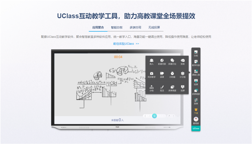 让应用更便捷:大屏支持小窗模式等比例缩放,方便全屏掌控,教学软件UClass支持云资料随行、多端协同,智能手势识别无需频繁切换,跨三层一步投屏稳定便捷,一键扫码精准考勤,一键发起互动轻松掌握学情,一键挑人活跃课堂气氛,轻松发起话题讨论词云自动分析,应用聚合统一教学应用和操作入口,为老师学生“减负”,为课堂教学“提效”。