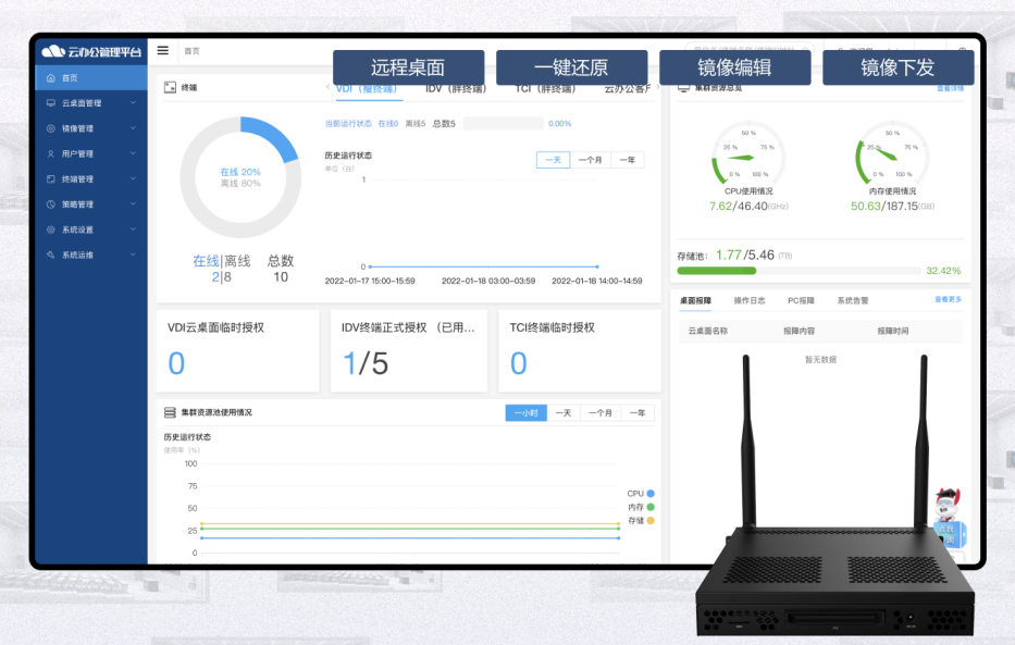 让运维更智能:创新云OPS,当设备出现故障时,运维人员不再需要反复跑现场,通过批量系统镜像下发,实现远程运维简单高效,且与云办公和云课堂共用服务器,真正实现全校一朵云。