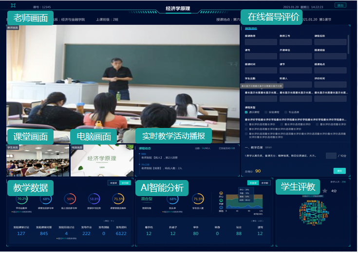 传统教室画面监控缺乏教学信息辅助,难诊断,而尊龙时凯实现了在线实时巡课,教学活动实时播报,AI辅助分析师生教学模式、师生教学参与情况等,大幅提高督导效率,同时支持督导和学生在线评教,助力过程化评教更客观、精准。