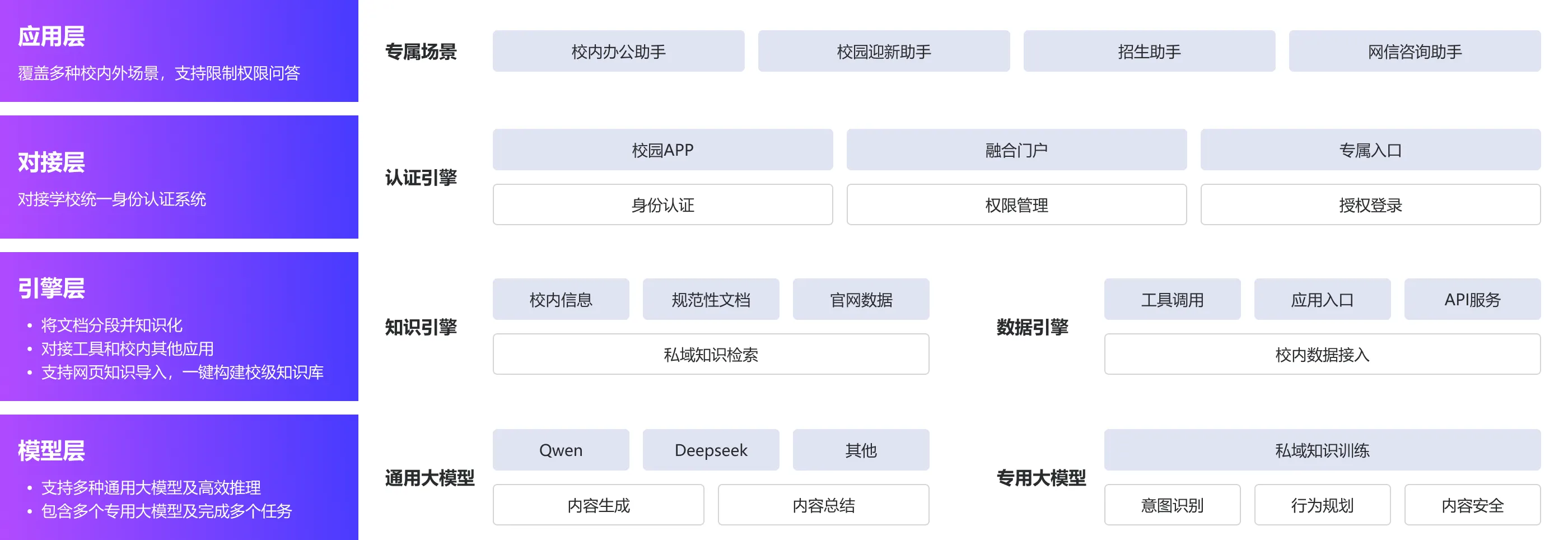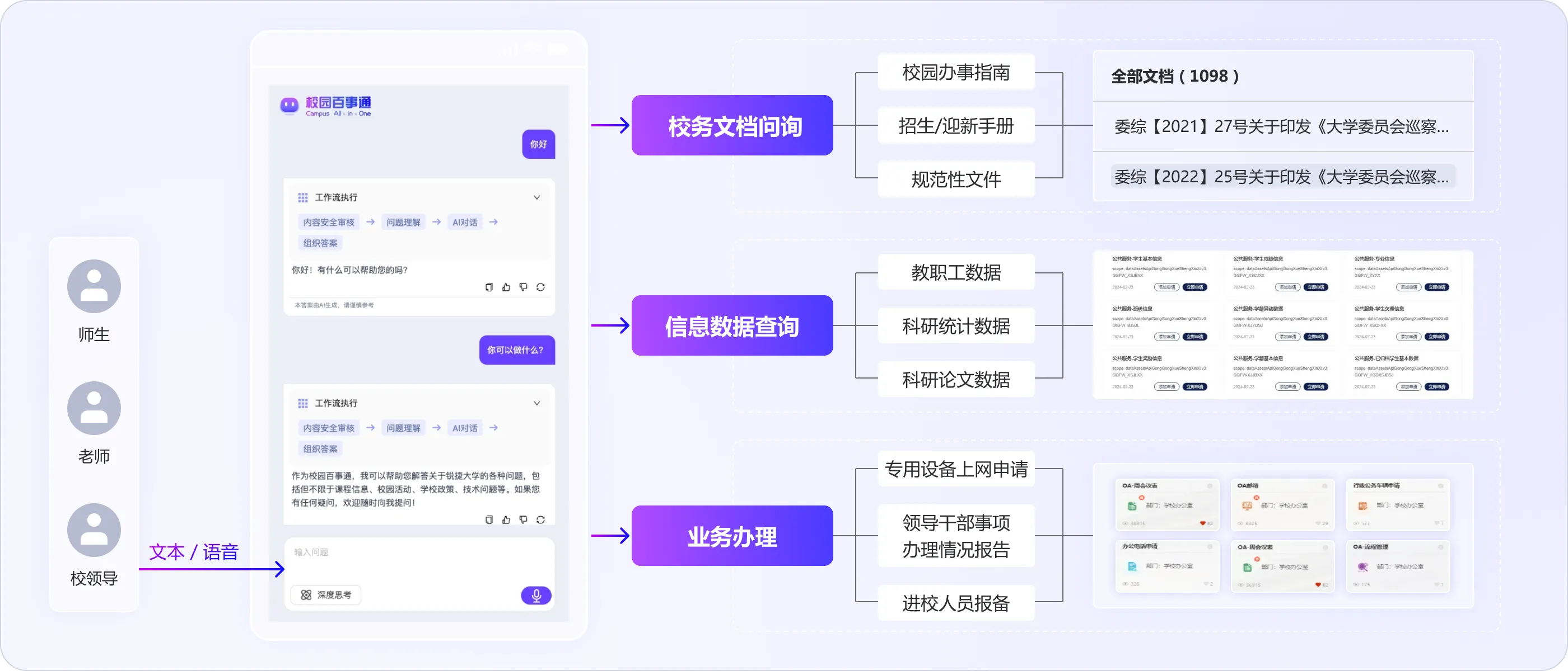 学校极其重视AI与校务、科研、教学等方向的结合,网信办希望打造全校的AI能力平台。针对教务管理、政策咨询、校园设施使用等场景,为师生提供关于校园生活各方面的智能引导和辅助。