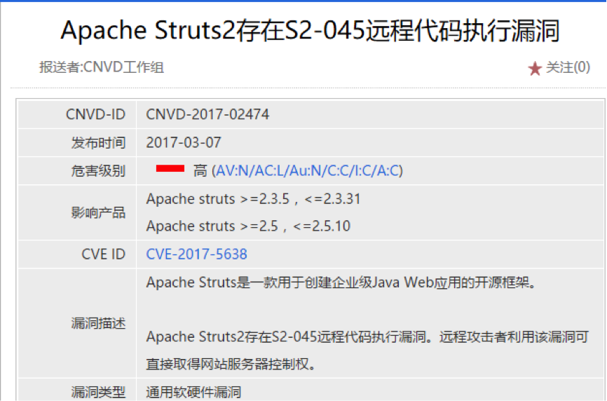 近日,安全研究人员发现著名J2EE框架——Struts2存在远程代码执行的漏洞,Struts2官方已经确认该漏洞(S2-045),国家信息安全漏洞共享平台定级为高危漏洞。