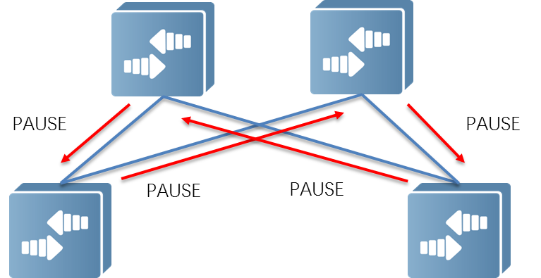 但在特殊情况下,例如发生链路故障或设备故障时,BGP路由重新收敛期间可能会出现短暂环路,会导致出现一个循环的缓冲区依赖。如下图所示,当4台交换机都达到XOFF水线,都同时向对端发送PAUSE帧,这个时候该拓扑中所有交换机都处于停流状态,由于PFC的反压效应,整个网络或部分网络的吞吐量将变为零。